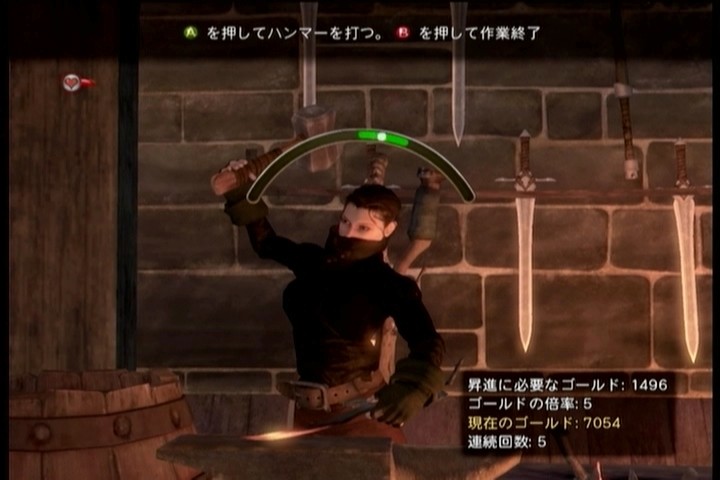 鍛冶屋、薪割りと違って、赤いゲージが伸びていって、それが黄色~緑となったらボタンを押すというもの。ゲージがMAXを越えるとジョッキを落としてしまい、そのジョッキを弁償しなければならない。