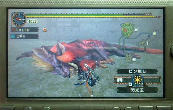 最初のリオレウスは楽勝楽勝~とお気楽にやってたのですが、一応少し効きの良い雷属性の武器でガンガン攻撃しいるのにもかかわらず、中々倒せません。