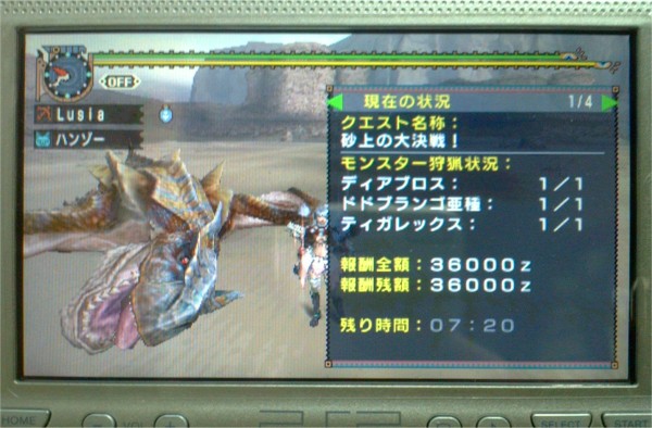早速挑んだのは「砂上の大決戦!」。敵はディアブロス、ドドブランゴ亜種、ティガレックスの三頭。