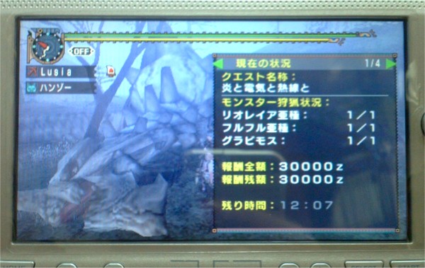 今回は「炎と電気と熱線と」からスタート。敵はリオレイア亜種、フルフル亜種、グラビモスの三頭。