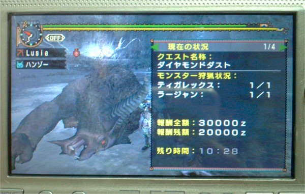 次は「ダイヤモンドダスト」。敵はティガレックスとラージャンの二頭。