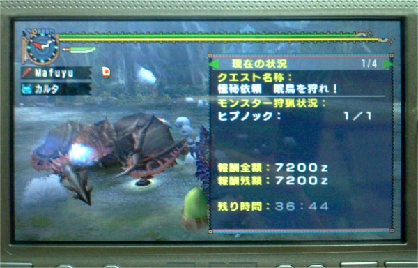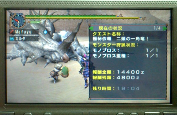 モノブロスはなんとかさっくり倒せました。が、問題はモノブロス亜種。こいつの攻撃力と体力の高さは結構きつく、ちょっと油断したらサクっと倒される始末。それで二落ちしてしまいかなりピンチ。