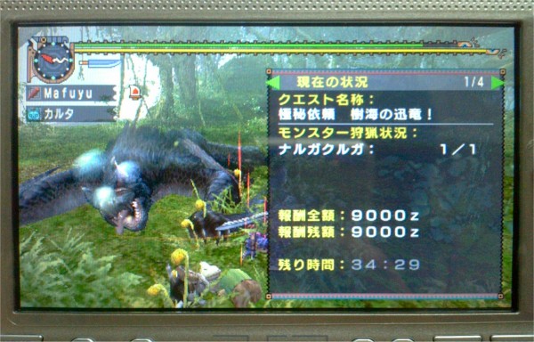 ビクビクしながら戦ってたのですが・・・・普通にやってたんではらちがあかないので、閃光玉を当てて股下でデンプシー。つーかここまでデカイと余裕で股下にもぐりこめるね・・・