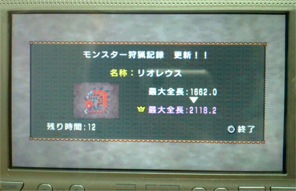 んで、なんとか19分ほどで撃破。そして清算後に納得。やはりこのリオレウス亜種は金冠クラスの大きさだったのね(ーー;)