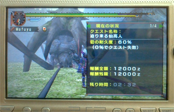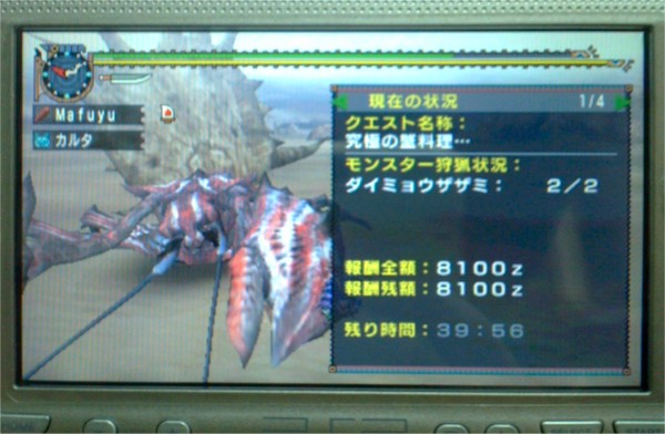 足を伸ばして立ち上がったら足をねちねち斬りまくり。これで結構ひるみまくってたのですが、意外と粘られて残り2分ちょっとのところでやっと討伐完了。