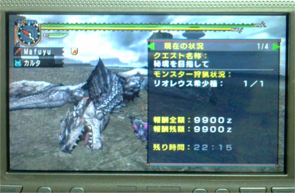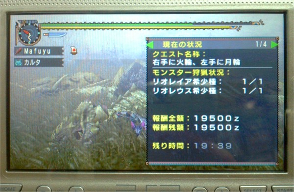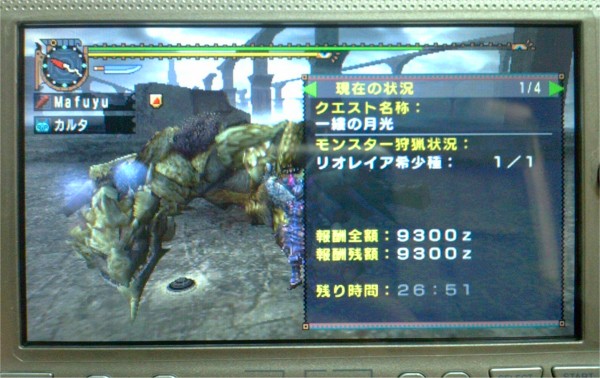 こうなると属性のまったくない攻撃力が低い武器と成り果ててしまうので長期戦になってしまい・・・・どーにかこーにか倒せたのは27分ほど経過した頃。まー、この攻撃力でこのタイムはまだマシな方かな・・・?