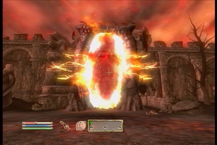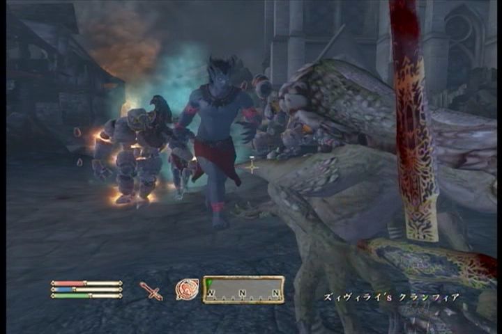 早速街の前まで行ってみたら・・・・・衛兵がオブリビオンの門が出てきた見たことないモンスターと戦ってるし(´Д`;)ヾ とりあえず加勢して敵を殲滅。衛兵に事情を聞いたら、マーティンは街中の礼拝堂にいるらしいが、目の前にあるオブリビオンの門を閉じないと街中には行けないらしい。