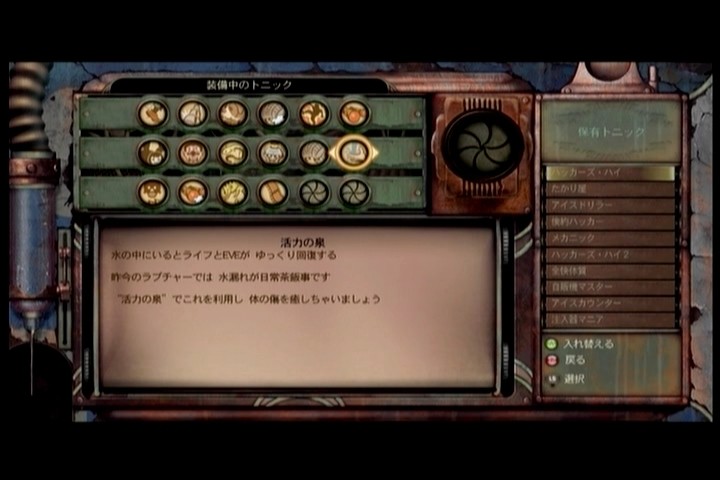 更に、スパイダースプライサーを研究すると手に入る「活力の泉」というジーントニックは水溜まりや滝のように流れ落ちてる水に触れるとじわじわと体力とEVEが回復するという優れ物で、電撃で敵の動きを止めてスピアガンで仕留める。そしてスピア弾は回収して、電撃で消費したEVEは水に浸かって回復する。という半永久機関ができちゃいます。
