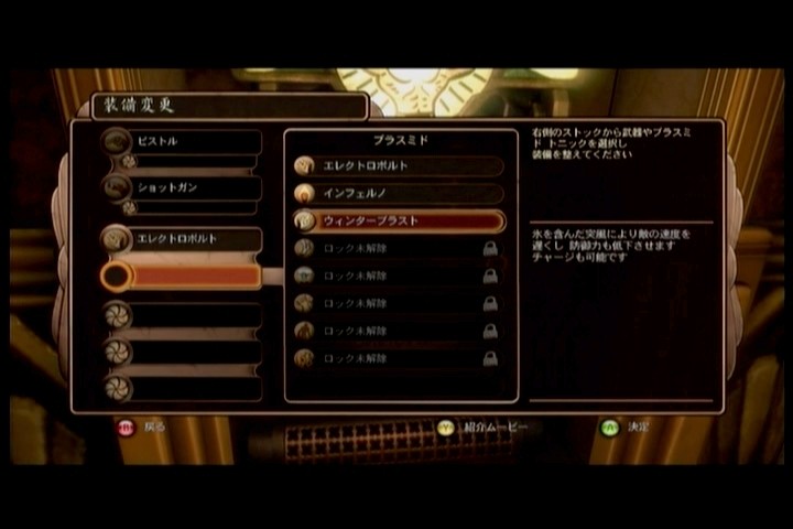 最初に選べるのは、武器はピストルとショットガン。プラスミドはエレクトロボルト、インフェルノ、ウィンターブラスト。ジーントニックは無し。