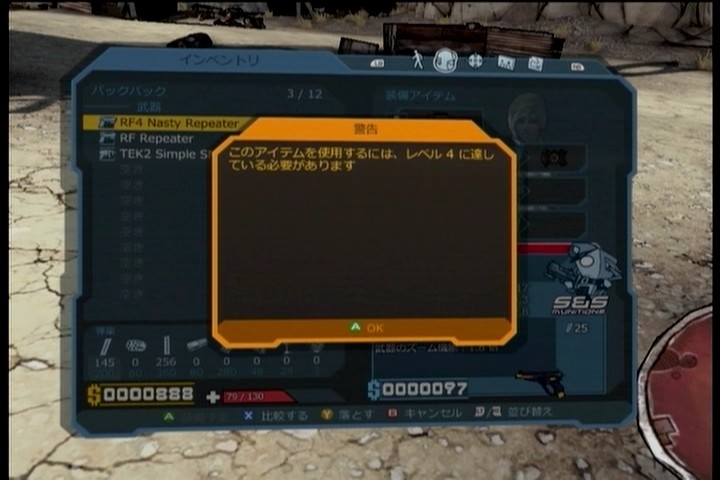 赤い箱があったので開けてみたら新しい武器が手に入りました。早速装備してみようとしたら・・・あれ?レベルが足りないので装備できないと警告が・・・