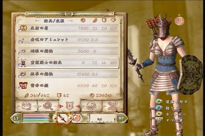 で、先ずは闘技場にいる鬼教官(?)オーウィンと話してボロクソに罵られつつ闘技場への参加権である特殊防具「重装闘士の防具」をゲット。これを装備してないと闘技場へ参加できないのですが、これがかなり性能が悪い。胴、篭手、両脚、両足を兼ねてるのに防御力は通常の胴装備程度。