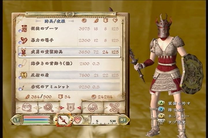 で、見事に「グランド・チャンピオン」になり、グレイ・プリンスの鎧を「武勇の重装防具」にしてもらい、これで一段落。まー、この武勇の重装防具はそこそこの能力アップの魔法がかかってるものの、やっぱり使えないモノなんですけどね|◎口◎|y-~~~