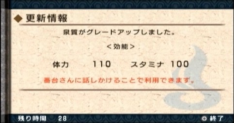 クリアすると温泉は泉質が上がって体力の上限が増えるようになりました。