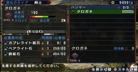 で、調子に乗ってギギネブラをいぢめまくってたら、やっとこさ必要数のカブレライト鉱石が集まりましたヽ(´ー`)ノ