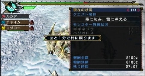 この強力な武器を持って先ず挑むのは、ギギネブラをいぢめてたら出たドリンククエスト、「毒に沈み、雪の凍える」です。