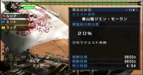 仕方ないので挑んでみますが・・・あきらかに村クエの時より良い動きでダメージを与え続けてるのに、船の耐久度の減り方が異様に早いです。