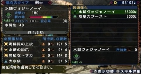 思ったより早く捕獲できるみたいで、ガンガン捕獲していってハンマーの「水鎚ヴォジャノーイ」(攻撃力180→195、水属性40)を作りました。