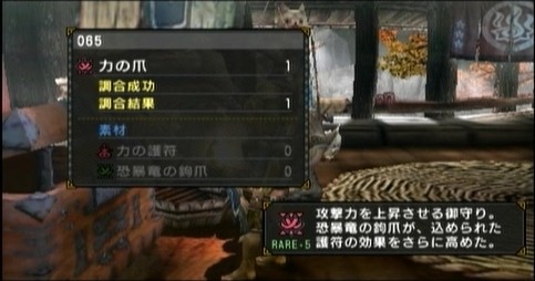 この素材だけでは意味ないかと思いきや、これと力or守りの護符を調合すると「力の爪」と「守りの爪」になりました。