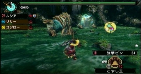 次にハンマーの「コキュートス」(攻撃力190→205、氷属性40)でやってみたら結構被ダメージありで捕獲に20分ちょっとかかりました。