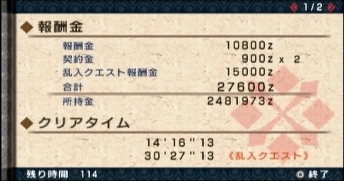ティガレックスは14分ちょっとで捕獲できたのに、オマケにこんなに時間かかるってのはちと辛いですねぇ(´д`)