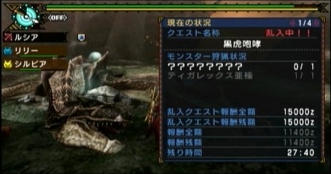 ティガレックス原種の時に2回狩ってるので、こいつでドリンククエスト発生条件最後の3匹目の乱入モンスターとなります。
