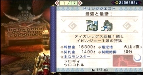 これは上位のティガレックスとベリオロス亜種の同時狩猟で、丁度今、ティガレックスの素材は欲しいし、このドリンククエストで追加されるドリンクにも興味があったのでやってみます。