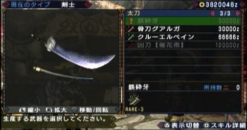 それで本作での性能は、攻撃力150→165、スロット3があるだけの無属性の太刀・・・