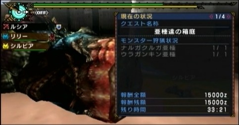 上位だし、一番の弱点属性じゃないから時間かかるだろうな~と思ったら、ナルガクルガ亜種は6分で討伐。ウラガンキン亜種は16分半で討伐できました。