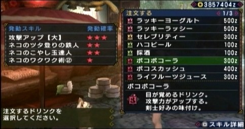 今まではクエスト報酬をより多く得るために招きネコの激運一筋でしたが、これからはクリア時間短縮のためにも攻撃系を飲もうかな~(´∀`)