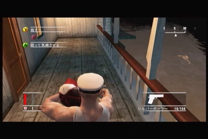 先ずは相手の背後に近寄り、そこで銃を抜いて相手を盾するように後ろから取り押さえます。すると、捕まえたままある程度自由に動けて、更に殴って気絶だけにとどめるという優しさ。更にそこから引きずって人目のつかない場所に放置したり、転落させて事故死に見せかけるなど自由自在!事故死に見せかけるとクリア後の評価も良くなりやすいですからねヽ(´ー`)ノ