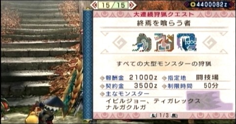 闘技場でイビルジョー単体→ティガレックスとナルガクルガの同時狩猟と続く高難易度クエスト。