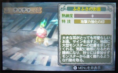 どうやらお面によって性格も変わるらしく、「ふさふさのお面」だとMHP3のオトモアイルーでいうところの平和主義っぽくなるのかな?
