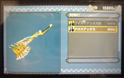 何匹か狩ったところで目当ての「ドロスアックス」(攻撃力506 水120 強属性ビン)を作成。