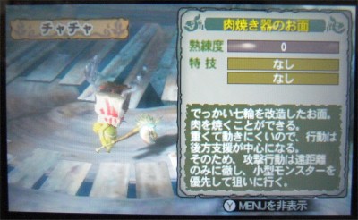 更に、特技を2つ付けられるし、肉焼きセットを持ってなくてもこのお面で生肉を焼けるのでかなり使えるお面ですね。