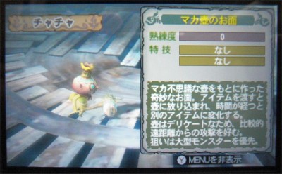 後、壺の中にアイテムを入れると別の何かに変化するらしいですが・・・ 個人的にはチャチャには雑魚掃除をメインでやってもらいたいのでお面は「肉焼き器のお面」のままで行こうと思います。