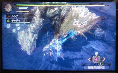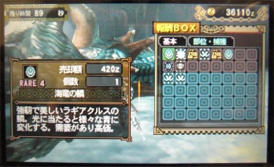 リオレイアは強敵かもしれませんが、水中戦はないし、戦い慣れてるし、滅龍ビンの付いてるディーエッジもあるし、なんとかなるかな~と。 結果は20分ちょっとで捕獲完了。