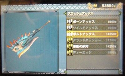 仕方ないので火属性のペキスパンダーか雷属性のボルトアックスのどちらで行こうかな~と悩み、真新しいボルトアックスで行く事に決めました。
