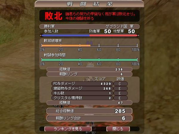 後、レベル13で一度だけ戦争に行ってみました。まー、経験値が欲しかったとか、戦争時のソーサラーの動きがどんなものか知りたかったとか理由はありますが、最大の理由はリング目当て(*'-')+ と、一応そこそこ戦ってみたのですが、やー、スパークフレア(中距離まで飛んで大爆発する火球)が楽しいね!(゜▽゜)