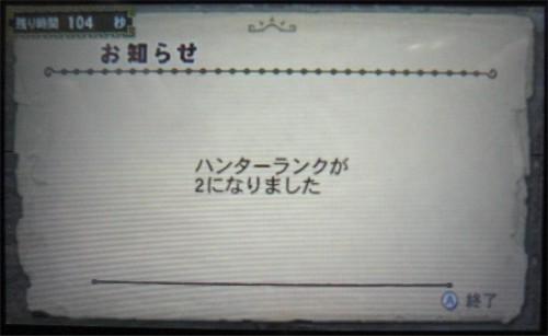 流石に港クエの敵は体力が多く、ちょっと長引きましたが20分弱で捕獲完了。無事にハンターランク2になりました。