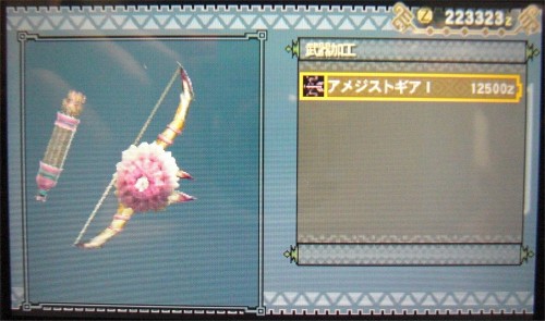 ここで炭鉱夫は一旦お休みにして、「スポンジギアII」を強化した「スポンジギアIII」を更に強化して作った弓「アメジストギアI」(攻撃力204 水120 放散型)を持ってウラガンキンを狩りにいきます 。