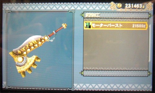 その素材で「クルペキスパンダー」を強化して「モーターバースト」(攻撃力874 火200 防御力+10 強属性ビン)を作成。