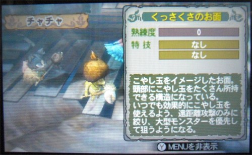 村に戻りチャチャとカヤンバと話したら「高速回復の印」を覚えました。 これをすぐにでも使わせたいんですけどねー・・・アイルーフェイクとメラルーフェイクって熟練度の上がり方がすっごい遅いんですよね。
