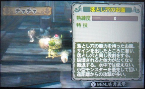 その素材で納品依頼をクリアして新しいお面「落とし穴のお面」をゲット。