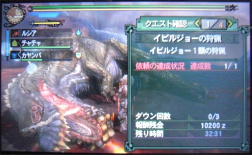 ただ、イビルジョーはMHP3では弓でしか戦った事がなかったので、接近戦はどうだろう・・・と思ったら、回避性能+2のおかげか、意外と戦いやすかったですね。