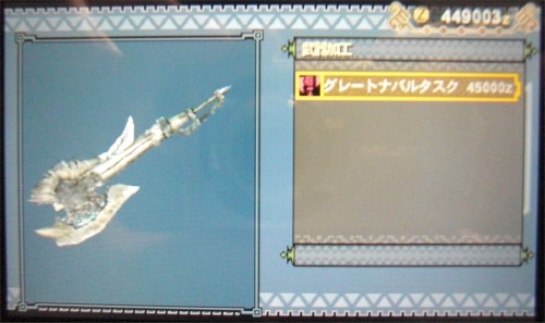 現状作れる水属性のスラッシュアックスではこれか「大魔鎖狩」のどちらかが最高のもので、両方持ってますが、今回は「グレートナバルタクス」でいってみます。