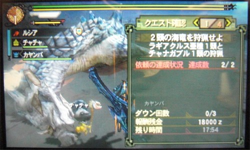 で、チャナガブルは15分半で捕獲して、ラギアクルス亜種は32分で捕獲。