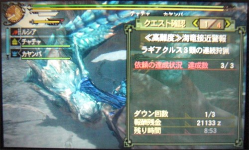 これはラギアクルスを3匹連続狩猟するクエストで、連続狩猟なのに剥ぎ取りで素材が出るというおいしいクエストなんですよね。