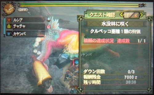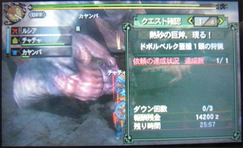 途中、リオレイア亜種を呼ばれてちょっとあせりましたが、それ以外は問題なく13分ちょっとで捕獲できました。