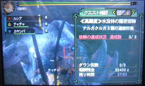 単体狩猟なら12分ほどで、港G級星7の「<<高難度>>水没林の隠密部隊」の3匹連続狩猟でも22分で終わるお手軽さ。