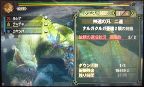 港G級星7の「神速の刃、二連」のナルガクルガ亜種2匹同時狩猟も初戦で事故って1落ちしたものの23分でクリアできるほどなので、さくさく狩っていきます。